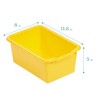 Keep your classroom and home organized, tidy, and efficient with ECR4Kids Scoop Front Storage Bins. The sturdy plastic bins are designed for everyday use to keep small items contained off the floor. Teachers, educators, and parents can utilize bins to store books, toys, manipulatives, and games. The open bin design displays and provides easy access to contents. Organize stories and label bins by reading level, theme, or holiday, encouraging children to independently select their favorite story and clean up during playtime. Personalize trays in classroom cubbies for children to store art projects, individual items, homework, and more. The Scoop Front Bins provide a flexible storage solution with endless possibilities for use from the garage to the kitchen pantry, or nursery. Durable plastic bins feature rounded edges, an easy-to-grasp scoop front handle, and a curved interior to simply remove contents. Lightweight bins are easy to pick up and carry, transporting from a storage cabinet to a play space. Bins nest to save space, and built-in stack supports prevent locking when empty. Use as standalone storage or pair with ECR4Kids storage lockers, cubby units, or tray cabinets; sold separately. The one-piece all plastic design comes fully assembled.