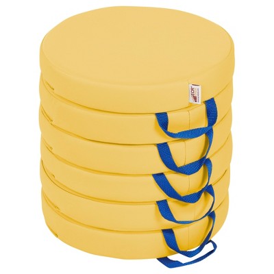 SoftZone Square Floor Cushions with Handles are an easy way to implement flexible seating, and circle up for story time, playtime, and other floor activities. This 6-piece set of cushions adds padded comfort when sitting on the floor in daycares, preschools, classrooms, or home learning environments. Dynamic learning environments in classrooms encourage collaboration and inspire creativity, critical thinking, and communication between students. Floor pillows are lightweight and constructed with a sewn-in nylon carry handle that makes it easy for little ones to pick up and transport. This versatile seating set allows for multiple configurations that suit your learning space. These colorful floor pads are designed with soft foam that keeps little learners comfortable during seated activities. Toddlers can practice color identification and autonomy as they select their favorite color. The foam core is covered with water-resistant polyurethane vegan leather with a durable woven backing and features a non-slip base for added stability. Fully stitched seams and soft edges make this seating set safe for children. When playtime is over, stack cushions vertically to save valuable classroom floor space or keep them organized with ECR4Kids Mobile Cushion Cart; sold separately.