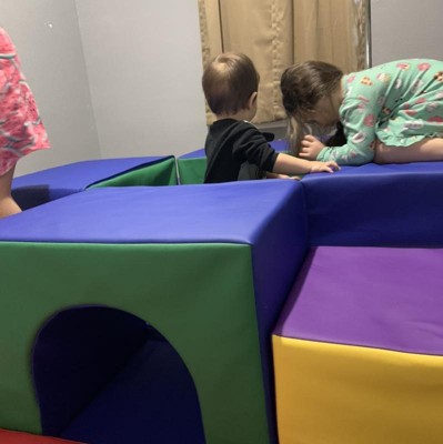 Give little ones a place to play and explore with ECR4Kids SoftZone 4-Tunnel Maze. The 360° climber includes four tunnels, two pedestals, two platforms, two ramps, and five pads, with endless opportunities for climbing, crawling, and social interaction. The multi-piece foam playset is designed for everyday use in a daycare, preschool, and is great for the home. The 15-piece climber is intended for safe indoor active play that promotes and strengthens early muscle movement, enhances physical coordination, and balance, and helps with overall body control. Keep curious babies active and engaged while encouraging little hands and feet to explore the gentle foam climbing structures. Step up, crawl over the tunnel, and slide back down. Toddlers can crawl through the tunnel with soft side pads to provide extra cushion. Multiple children can play at once encouraging a collaborative environment and socialization. Use shapes independently or as a part of a fun obstacle course. As kids explore, they gain self-confidence while improving hand-eye coordination, and agility. The foam core is covered with water-resistant polyurethane vegan leather with a durable woven backing and features a non-slip base for added stability. Lightweight blocks are easy to carry and stack for storage.