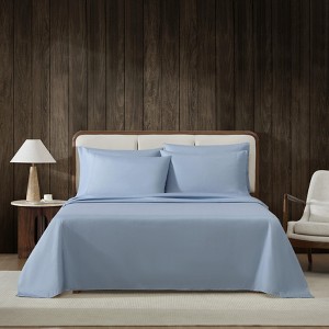 Introducing the Logan collection temperature regulating sheet set from Eddie Bauer. This 6-piece sheet set includes one fitted sheet, one flat sheet, and four pillowcases (twin size includes two pillowcases). The fitted sheet features an all-around exposed elastic, ensuring a perfect, snug fit that stays in place throughout the night. The temperature-regulating fabric adds an extra layer of comfort, keeping you cool in the summer and warm in the winter. This thoughtful design enhances your sleep experience, providing both a secure fit and year-round comfort. Available in soothing colors like blue fog, dark khaki beige, olive green, and crisp white, the Logan collection sheet adds a touch of refined simplicity to any bedroom. This versatile set is available in twin, full, queen, and king sizes, offering a stylish and sustainable option for your bedding needs.
