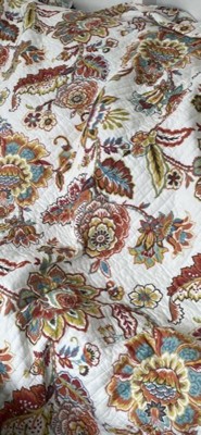 [This review was collected as part of a promotion.] This quilt is high quality . The floral pattern in orange, gold and blue shades against a cream background is so beautiful. The reverse side is a soft blue diamond pattern. It is a heavier weighted quilt perfect for Fall weather or cool air conditioned rooms. It is machine washable and 100% cotton. It feels soft against the skin. I highly recommend this quilt.