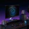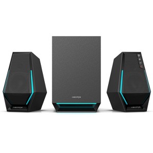 The Edifier® G1500 MAX 2.1 Gaming Speaker System boasts a peak power of 60 watts and ensures immersive audio experiences. With dual 2.5-in. full-range speaker drivers in each satellite, it produces superb sound quality. Complemented by a 4-in. subwoofer, the system delivers deep, impactful bass, enhancing the quality of music, movies, or games. Experience the realism of explosions, gunfire, and footsteps as if on a genuine battlefield. Equipped with 2.5-in. full-range drivers in both left and right channels, enjoy a balanced listening experience and heightened stereo sound quality. This gaming speaker system boasts 10 dynamic light effects and 16.8-million light colors synchronizing with the sound, creating an immersive experience where light and shadow dance to the rhythm. Easily customize your desktop ambiance with a single click, adding depth to your gaming setup and enriching your auditory journey._