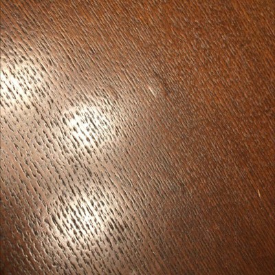 This is a large and attractive table, it is stable and sturdy. The finish is very shiny (looks a little fake), and after just a year and a half of owning this table, I am already looking to replace it as there are tons of chips on the top surface of the table. Its really easy to make a scrape, displaying the very light "wood" underneath the original finish.