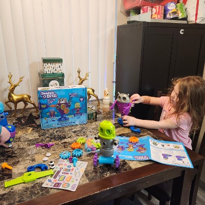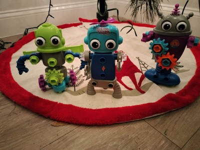 Robot designers, welcome to your lab. Customize your robots by mixing and matching pieces. With over 70 pieces included, kids ages 3+ can mix and match to create hundreds of combinations. Pick your pieces, then use the kid-friendly tools to assemble your robot, then take it apart and do it all over again! Encourage creativity and imagination with pretend play. This STEM toy introduces early engineering, fine motor skill development, and problem-solving. Includes kid-friendly drill, Phillips bit, screwdriver, gear socket bit, 32 bolts, 26 interchangeable pieces, seven gears, and sticker sheet. Requires 2 AA batteries (not included). Drill U.S. Patent Number D929,837