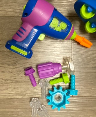 - FINE MOTOR TOY INCLUDES: Kid-friendly drill, Phillips bit, screwdriver, gear socket bit, 32 bolts, 26 interchangeable pieces, seven gears, and sticker sheet. Ages 3+. Requires 2 AA batteries (not included). Drill U.S. Patent Number D929,837
