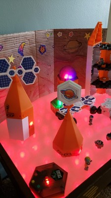 - EVERYTHING YOU NEED to build a rocket with light-up nose cone and rocket nozzles, Space Rover with light-up headlights, and Landing Pad with colored-changing lights. Also includes astronaut and robot figures for pretend play. and stickers for customization. Rocket, Landing Pad, and Rover require 3 AAA batteries each, not included