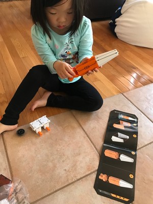 Construction play meets electrical engineering in this simple, snap together building system! Line up the circuitry graphics on the over-sized pieces and snap them together to build a fully powered, large-scale, space-themed world. Follow the easy instructions to build a Rocket with light-up Nose Cone and Nozzles, Space Rover with light-up headlights, and Landing Pad with color changing light effects—or connect the pieces your way to make out-of-this-world custom, light-up, builds. Then launch into hours of screen-free, pretend-play fun with the included astronaut and robot figures!