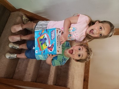 [This review was collected as part of a promotion.] My 2 boys were very excited about this activity. It's very colorful, and quickly teaches them the shapes of each letter and number, as well as colors. It's a good game to spend some time on to get away from screens. My only complaint is that it's a person activity, since it only comes with one battery operated drill. Which is fine for some people. But my boys are so close in age, so it needs to be a team effort.