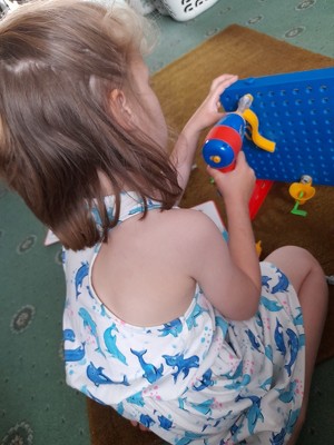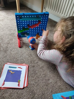Dotty really enjoyed, planning out and drilling in her maze. She got a little frustrated when she picked up the wrong piece but after a while she got it, the ball needed to go through the holes to follow on the maze. Really colourful product which helps with problem solving and maze making and planning. She has also been setting daddy mazes to solve. Dotty also loved being able to see the drill working inside and out. Forwards and backwards drilling make things easier for new mazes. Strong box for storage and all fits back in nicely.