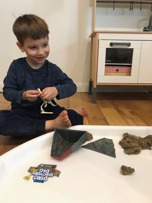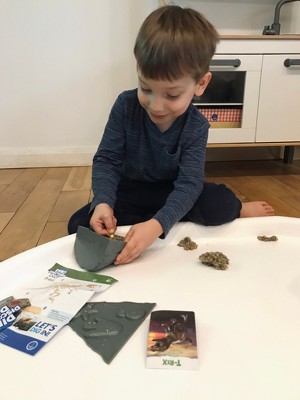 We love this excavating fun! The dino was a tad tricky to build, otherwise I would have given this 5 stars. But my little one had a lot of fun being a tiny paleontologist! The 'stony ground' is great to dig through, and generally mess-free (win), and I love that it can be used again and again! Digging for the hidden gem was great fun too, and we loved guessing which one was going to be in our volcano.
