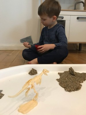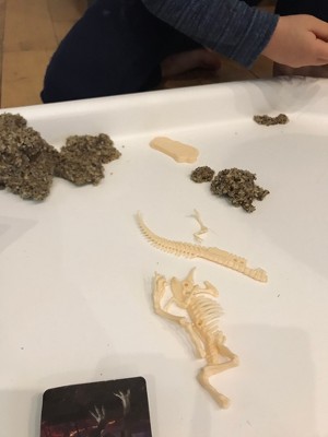 [This review was collected as part of a promotion.] My daughter really enjoyed playing with the sand and thought it was neat to have the dinosaur bones inside. We were missing a arm for the dinosaur in our package. The texture of the sand was really strange to me but my daughter liked it so that's all that mattered. It was was a nice hands on Interactive activity for littles.