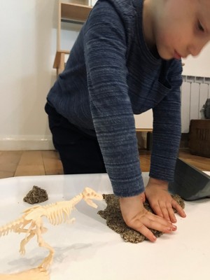 [This review was collected as part of a promotion.] Our son loved playing with the Dino Discovery Dig. We did find the Dino Dirt was hard to dig through with the plastic shovel that came included and had to use a metal spoon. Building the dinosaur was a little tough for my 4 year old however, once we built it for him he loved playing with it.