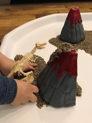[This review was collected as part of a promotion.] My 5 and 3 year old boys LOVED this toy. The sand did not dry out after multiple uses and I was even able to separate the sand and fossils into separte plates so that both boys can play at once. One con was that the fossils were a little flimsy and a bit difficult to stand up once built, and the volcano storage case did not stay closed well once the sand was put back after play (this was an easy fix by placing the whole thing in a small ziplock bag for storage). This is a great little toy that kept my boys occupied for a long time!