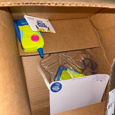 Copy that! The world's simplest walkie talkies for toddlers are here to spark more exploration. These durable kid walkie talkies are the perfect tool to encourage indoor and outdoor exploration, observation, independent play, and communication skills. Each features a single button for easy use, a secure kid-to-kid radio channel, wrist strap, and 300-foot range (90 meters). Requires a total of 6 AAA batteries (3 each, not included). If you hear static, try turning walkies off, back on, and pressing the talk button to reconnect them. Keep at least 5 feet of distance between units when speaking to avoid feedback.