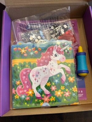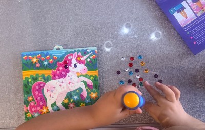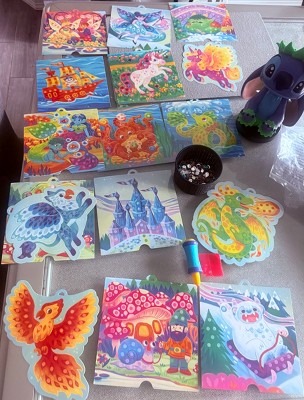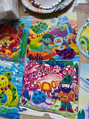 Kiss the mess and stress of other art projects goodbye! Elevate the viral diamond painting trend to a mess-free, satisfying craft with the easy-to-use jumbo gem popper tool, perfect for kids ages 5+. Follow simple, step-by-step instructions to bedazzle fantasy-themed design cards. This hands-on set develops fine motor, color matching & patterning skills, and encourages self-expression & independence. Once all the cards are decorated, you can fit them together like puzzle pieces to reveal a fantastical scene! Includes gem popper tool, 500 jumbo gems, and 16 design cards. No glue, no scissors, and no parental prep work required!