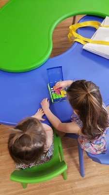 My class was so excited to get Kanoodle Jr. Our first impression of the game was the it was very colorful and inviting. We really liked how the pieces are large and easy to grasp. The game directions are well written and the levels are clearly marked on each game. We enjoyed the variety of puzzle themes (rockets, popsicles, dinosaurs, doughnuts ect.) this kept the game exciting and engaging. The only thing I will be changing to meet the needs of our preschool will be to laminate the puzzles to accommodate all of the little hands that will be using them daily. I love all of the skills my preschoolers will get to practice while using this game!