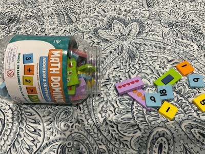 - DOMINOES SET INCLUDES: 60 Number and math symbol dominoes (1" x 1"), 40 math picture dominoes (1" x 2"), storage bucket, and activity guide. Ages 3+