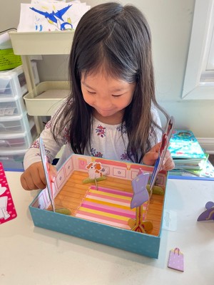 This sweet boutique was a gift for my 3 yr old and she loved coloring the outfits and sticking the clothes on the dolls.