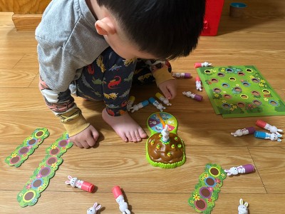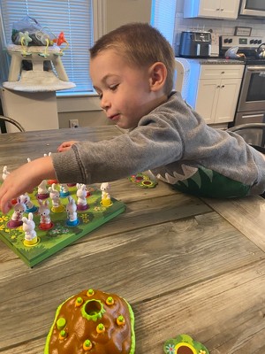 [This review was collected as part of a promotion.] This product was received in exchange for this review. Overall, this is a great product for early color identification and matching skills. Our toddler loves to watch the bunnies hop. Our biggest con is that when the bunnies are in the larger patch they are harder to pull out and at times it pulls the whole game board up.