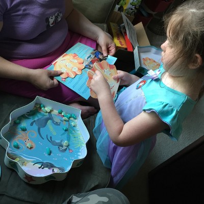 My four year old son enjoys this game and we can easily play as a whole family. The spinner and otter tongs are great for developing his fine motor skills, and he enjoys matching the shell patterns to his game board and the spinner.