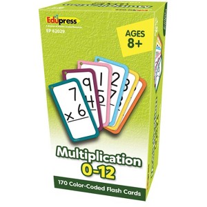 Edupress™ Multiplication Flash Cards - All Facts 0-12 | Teach and review multiplication facts individually, in groups, or with the whole class! Each flash card set contains a collection of full-color, high-interest student cards as well as instructions and tips for the teacher or parent, suggested activities, and additional blank cards. Each card has a hole in the top corner that can be fit with a ring or string to help with organization and storage. Additionally, each card has one corner that is shaped differently than the others. By lining up the non-rounded corners, the flash cards can quickly be faced in the same direction. When applicable, flash card sets include answers in small print on the reverse side of each card. Each card measures 3-1/8" x 5-1/8". Each set includes 170 double-sided cards.