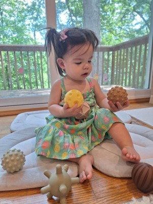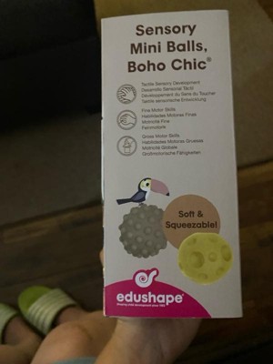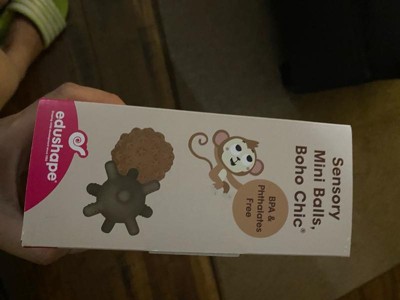 [This review was collected as part of a promotion.] Edushape Boho Chic Sensory Mini Balls are amazing. The material is a soft but still firm plastic that is great for when little ones are teething. But the balls are not too small that they would be a choking hazard. Very durable and each one is a different design.