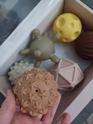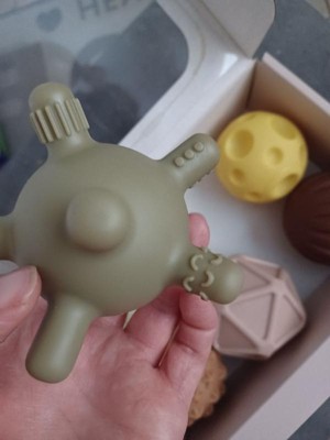 [This review was collected as part of a promotion.] Great sensory toy for infants and toddlers. Different shapes and sizes. Perfect size so that they don’t put in their mouth. Hard plastic or idk what material but definitely great quality. A little hard but that’s all part of sensory.