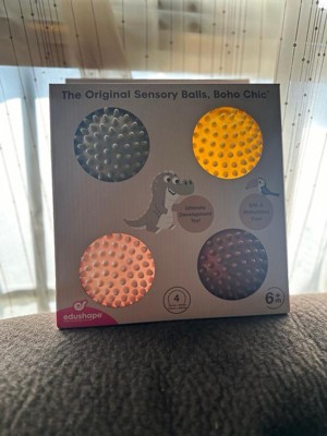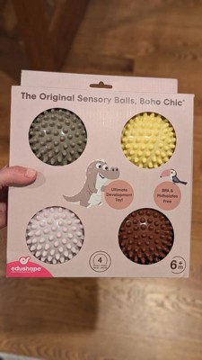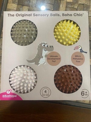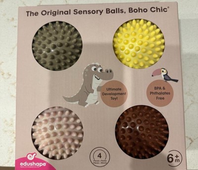 Best for Motor skills. This set contains four smaller balls that are easy to grasp and very light. Babies love to roll them, toss them, and play catch with others. The Original Sensory Balls by Edushape are the highest quality Sensory Balls in the market. Edushape invented the world's first Sensory Ball in 1997 and has since launched over 20 different variations of the Original Sensory Ball with different colors, textures, and shapes. Edushape's Sensory Balls are soft, and stimulating, and encourage your little ones to reach out and explore the world around us! Their unique texture and their easy grip allow Tactile Sensory Development including Gross Motor Skills, Hand-Eye Coordination, Logic & Reasoning, Socialization, and many more! Product Features: 4" Boho Chic Sensory Ball ; BPA & Phthalate free for baby's safety; Durable, bouncy, lightweight, great texture, hold air well, and soft.