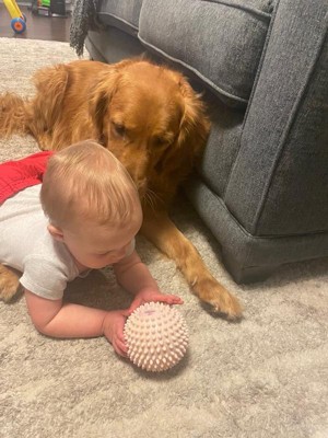 [This review was collected as part of a promotion.] My 10 month old absolutely loves these balls but so does our Golden Retriever. They look exactly like many dog toys especially because of the texture. My son and dog were pushing the ball back and forth and my dog popped it when picking it up. I saw it happen and it wasn’t a crazy amount of pressure so I am disappointed in the quality but glad it popped on the dog who wasn’t phased and not our baby. They are dyed different colors and on the lighter ones you can see dye splatter, since babies put everything in their mouths that concerns me. Not sure if I got a bad batch but I wouldn’t go out of my way to purchase this brand of toys, the issues lead me to believe they are cheaply manufactured and quality control is lacking.