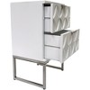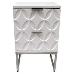 This 2 drawers end table has a minimal footprint, making it ideal in smaller family rooms or cramped corners. It's built on a metal base with two sled legs for a modern silhouette. The table is made from engineered wood in a crisp white finish and features an inlaid lattice-inspired design on the drawer fronts. Metallic gray finished handles and wood slides make it easy to access your nighttime essentials. This end table measures 17.25'' wide and 13.25'' deep, so it can fit between your bed and wall, while the 28.25" height makes it an ideal fit next to standard size bed frames and sofas.