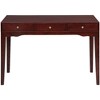 Elevate your home office or study space with this timeless writing desk featuring rubber wood construction in cherry finish. The sleek, minimalist design incorporates three spacious drawers with elegant brass-finished knobs, perfect for organizing your workspace essentials. The table's clean lines and gently curved apron add a touch of sophistication, while its sturdy legs ensure stability. This versatile desk works beautifully as a laptop workstation, vanity table, or entryway console. The smooth, polished surface provides ample room for your computer, books, or decorative items. Its classic style seamlessly blends with both traditional and contemporary decor, making it an enduring addition to any room. The desk's solid construction and practical storage solutions combine functionality with refined aesthetics for your daily needs.