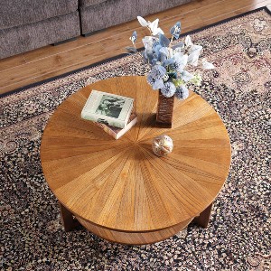 Elevate your living space with this beautifully crafted solid wood round coffee table. Featuring a stunning natural finish that highlights the wood grain, this table brings a touch of rustic charm and warmth to any room. The round design ensures a soft visual appeal, making it a perfect centerpiece for your living room.