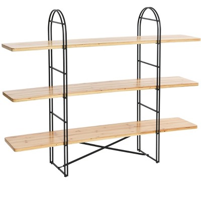 - Eitri Shelf unit features three (3) genuine wood shelves finished in a light brown driftwood effect inspired by the Pacific coast; frame is constructed of a sturdy double rounded black iron