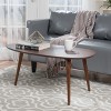 MID-CENTURY MODERN: Blending together iconic splayed legs with a tapered oval-shaped tabletop, our coffee table offers a mid-century look to your lounge space. With its clean lines and understated look, this table uses new materials to reimagine a traditional design.