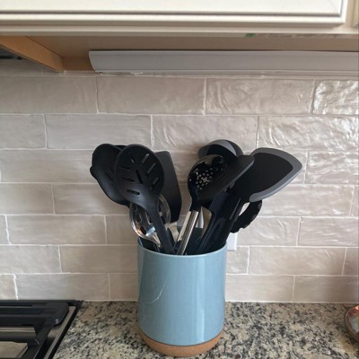 CORK BOTTOM: Glossy utensil holder features a thick cork bottom to prevent scratching your surface; Fun, colorful addition to your kitchen countertop d�corNEAT AND ORGANIZED: Keep your stovetop or countertop organized while containing all utensils in one convenient placeOVERSIZE VOLUME: Holds many utensils with a height of approximately 7.2 inches and a diameter of approximately 6.2 inches; Made of ceramic stonewareCARE AND CLEANING: Handwash only, do not microwaveGREAT GIFT or SELF PURCHASE - Contained in protective packaging; Ready to be gifted or added to your daily dishes at home; We care about our customers, please reach out to us if there is any problem with your order