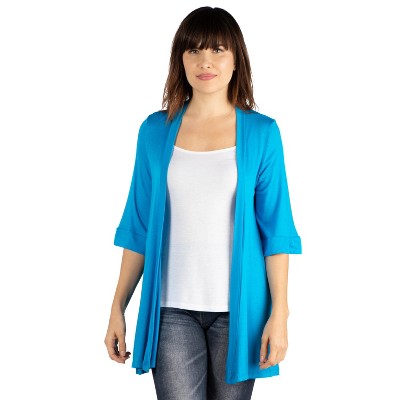 An easy add on to any look, this elbow length sleeve maternity cardigan for women is a great wardrobe staple. Featuring loose fit elbow length sleeves, open front design, and extend length, and a comfortable relaxed fit. Simply throw this cardigan on over a tshirt and jeans look for an added touch of style. Available in eight classic colors and made from a comfortable stretch material that is machine washable.