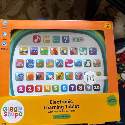 This Electronic Learning Tablet with Light Soft Handle Bilingual from Gigglescape™ makes learning fun, easy, colorful and musical for your little one. Designed like a vibrant tablet, this bilingual learning toy teaches in English and Spanish. It offers four touch-activated ways for your little one to learn — identifying letters and numbers, recognizing words and objects, engaging in question-and-answer sessions with guessing games, and exploring music-based learning. Plus, it comes with a soft handle for easy portability and convenient on-the-go education.