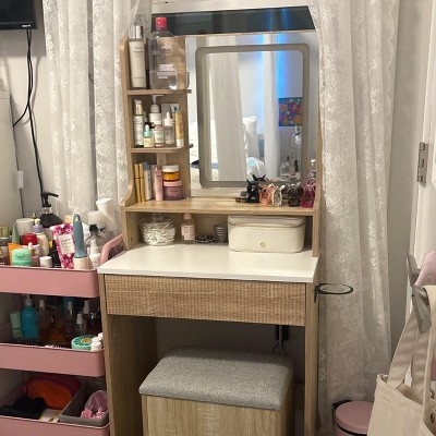 ELECWISH 23.6" Wood Grain Makeup Vanity Desk Set with LED Mirror & Stool - 3-Way Lighting, USB Charging Station, Blow Dryer Holder, Storage Shelves