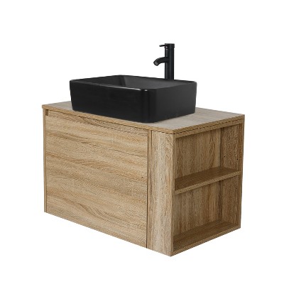 The ELECWISH 30-inch wall-mounted bathroom vanity features a modern floating design that instantly makes your bathroom feel more spacious, while its wide cabinet and hidden drawer provide ample extra storage to keep everything organized. This complete set comes with everything you need for a seamless installation, including the vanity, your choice of a ceramic, boat-shaped glass, or leaf-shaped glass sink, a faucet, pop-up drain, water lines, and mounting hardware. Designed with a versatile and stylish natural finish, it complements most bathroom decors perfectly and offers a straightforward installation process for a hassle-free upgrade.