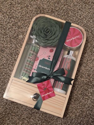 This holiday bath and body gift set with a strawberry fragrance makes an excellent gift. It is packaged with a nice wooden box and bow. The products all smell amazing. The shower gel feels good on my skin, as does the lotion. The exfoliator is a bit thin (minus one star) but still does a nice job of removing dead skin. I have not tried the bath salts yet, but am excited to do so. Overall, a great product!