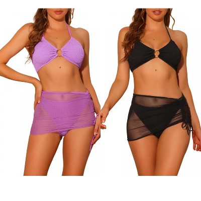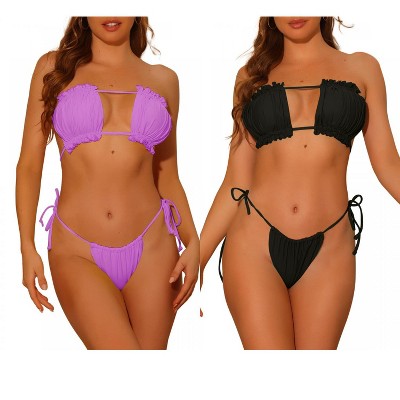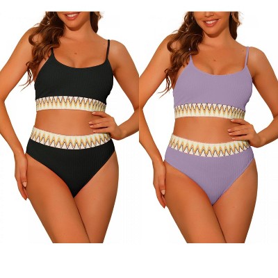 2 pieces, solid color, basic style, ribbed textured fabric, deep V-neck triangle bikini top with 4 rings, adjustable wide straps, back clasp, removable padded cups, wire free, quick dry
