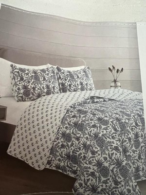 I purchased this quilt in a Queen size for my regular (no extra height) Queen sized mattress, and wish I'd ordered a King size. The quilt barely covers the mattress on all sides with no extra overhang. The 2 pillow shams accommodate rather flat, standard sized pillows, but would not close over an extra stuffed pillow. The print in gray blue hues is very pretty, reversible, and just like the photos. Calling this a "quilt" rather than a bedspread is a bit of a stretch. It's very thin and lightweight, and seems to only have the thinnest layer of polyester batting inside, and is channel stitched. It works for N. California summers where I live. Finally, the cotton fabric is somewhat rough, and not a "voile" that I usually prefer. Perhaps it will soften over time with washing. Overall, I'd suggest sizing up for a more luxurious look in your bedroom.