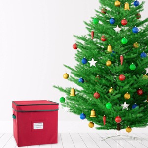 - PRODUCT DETAILS: Materials: 600D Oxford Canvas, PVC Label Holder, and Cardboard Dividers. Dimensions: Assembled: (L) 12" x (W) 12" x (H) 12"; Collapsed: (L) 13" x (W) 13" x (H) 2.5". Color: Red. Capacity: Holds 64 Christmas ornaments 3 inches in diameter.