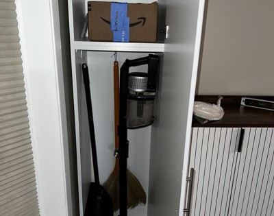 Wanted specifically a "broom" closet without shelves to store brooms mops and a small cordless vac. This fits the height requirement BUT when I got it together "without" using any shelves, the door falls inside without a shelf to hold it at the interior edge. So I will have to "engineer" two small Shim pieces to act as the door-stop! NOT what this "chick" really wanted to do! If it's a BROOM closet, it should go together for things that height! More suited for tall, narrow storage shelf unit. Pricey for the quality and poor instructions.