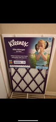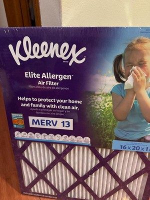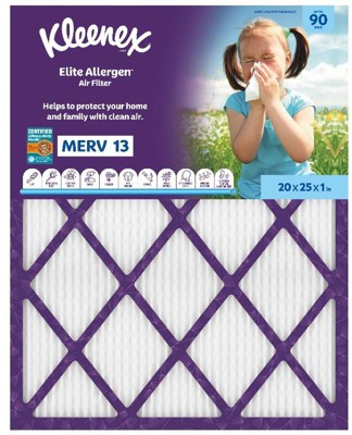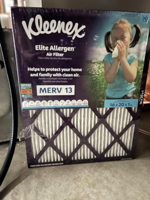 Kleenex Elite Allergen Air Filters Merv 13 (2-Pack) help capture hard to see microparticles including lint, dust, mold spores, smog, pollen, pet dander, smoke, cough/sneeze debris, airborne bacteria, and particles that can carry viruses. The MERV 13 rated air filter media is electrostatically charged to trap particles, making it easy to deep clean your indoor air. Patented Dual Air Flow Technology. Certified Asthma & Allergy Friendly®. Protect your home and family.
