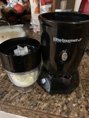 [This review was collected as part of a promotion.] I was very excited to receive my new Elite Cuisine Personal Drink Blender. I love that it comes w travel mugs and lids. It is very convenient for on the go person like me who has no time for washing extra dishes. I also like the small cup it comes with. I usually use that one to puree onions or other ingredients. It does a great job chopping and pureeing things. There are two things that I dislike about this blender. It only has a pulse power button, and you have to hold it to turn it on. I wish they actually made it w an on/off switch. Another thing that I dislike is that my cups do not lock in at the base. It locks it in until I start the blender; after it starts working, it slowly slides out and makes the blender shut off. The only way to make it work is always to hold the cup in place (w one hand) and hold a pulse button w another. It is not a big deal but smth that needs improvement.