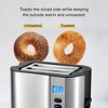 [This review was collected as part of a promotion.] This toaster works great. It is especially good for toasting bagels as it will toast only one side of them. It has an additional bagel setting and a defrost setting. It has a lit digital count down time. There is an eject/ cancel button in case you would want to stop toasting early. There is a warming track above the toast slots. Very nice toaster.