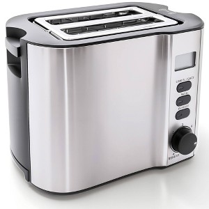 [This review was collected as part of a promotion.] This is a nice 2 slice toaster. It has a digital window to let you know how much time is left on your current toasting. The slots are wide to accommodate extra wide bread and bagels without stuffing them in. There is a retractable warming rack to heat items on top as well. This rack probably would work well with danish, etc. The stainless steel finish is brushed so fingerprints aren't so easily transferred. The pop up of your food is quiet, and it does not launch out of the tray.