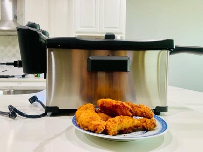 [This review was collected as part of a promotion.] This small deep fryer is the perfect size for my counter. The basket is small so it holds about 2 portions. It heats up quickly and I love the cover. I can look in and see how the food is coming along. I’m really happy to have it because it makes frying chicken easier.
