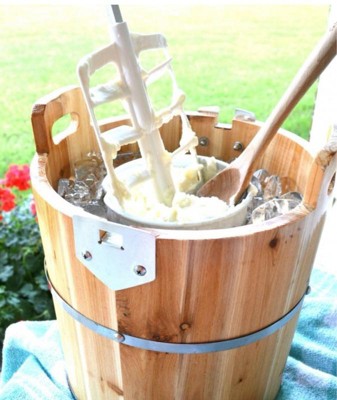 - The old-fashioned pine wood bucket holds ice and rock salt, keeping the canister at the optimal 10°F temperature.